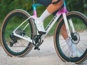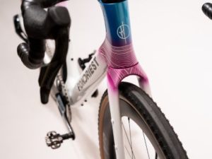 La prima colorazione con finitura lucida parte dalla parte alta del telaio, con un gradual di azzurro e viola per terminare con un bianco ghiaccio per buona parte telaio, per evidenziare il design pulito del marchio Fondriest. La seconda colorazione invece ha una finitura opaca, dove tutto lungo la parte del top tube si integra un effetto iridescente che passa dal bronze al verde, a seconda di come viene colpito dalla luce.