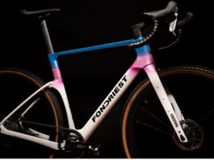 La prima colorazione con finitura lucida parte dalla parte alta del telaio, con un gradual di azzurro e viola per terminare con un bianco ghiaccio per buona parte telaio, per evidenziare il design pulito del marchio Fondriest. La seconda colorazione invece ha una finitura opaca, dove tutto lungo la parte del top tube si integra un effetto iridescente che passa dal bronze al verde, a seconda di come viene colpito dalla luce.